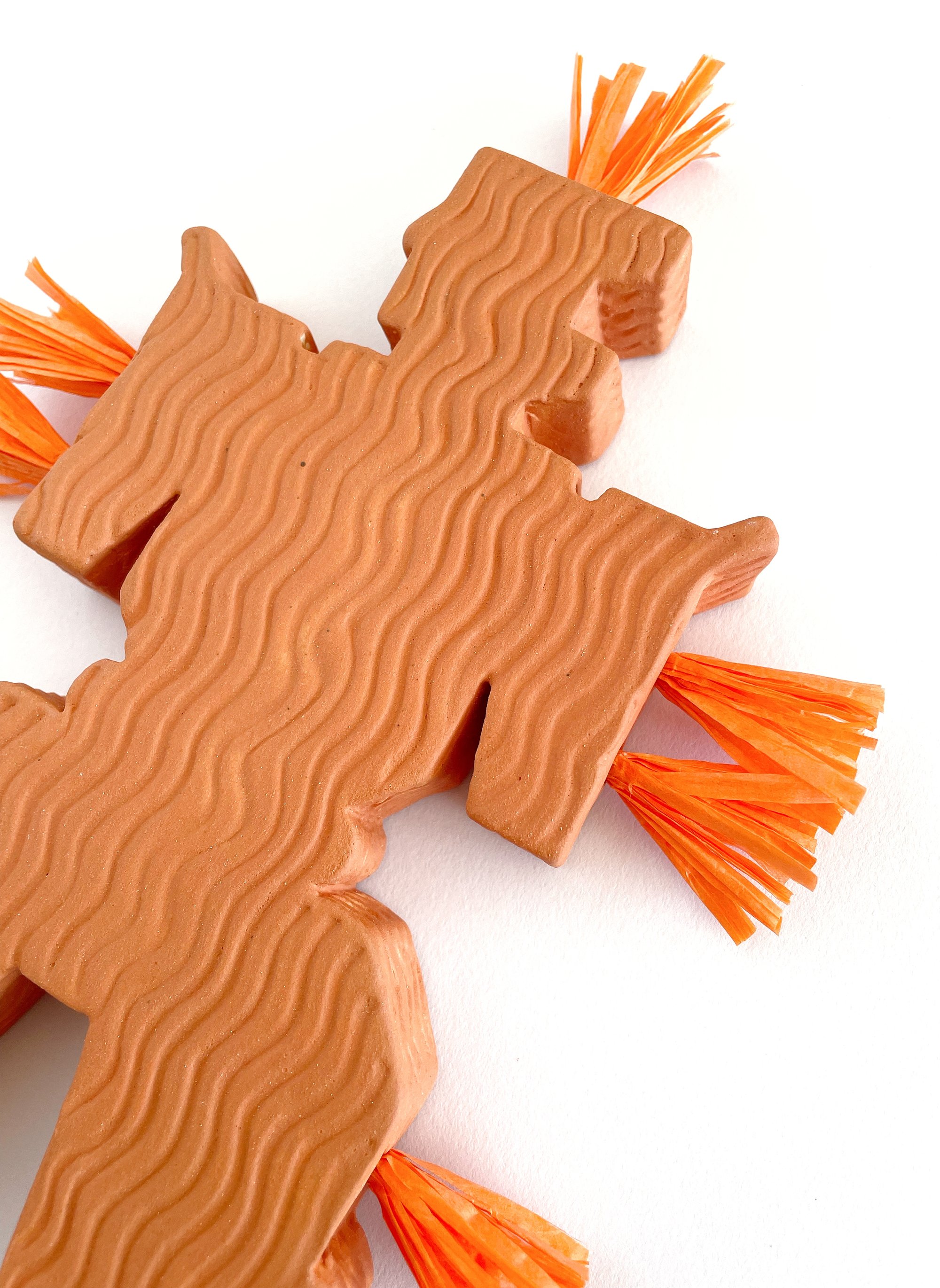 Objeto de decoración para colgar. Hombre de gres hecho a mano. Modelado, carvado y pintado con engobes cerámicos.
