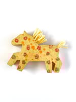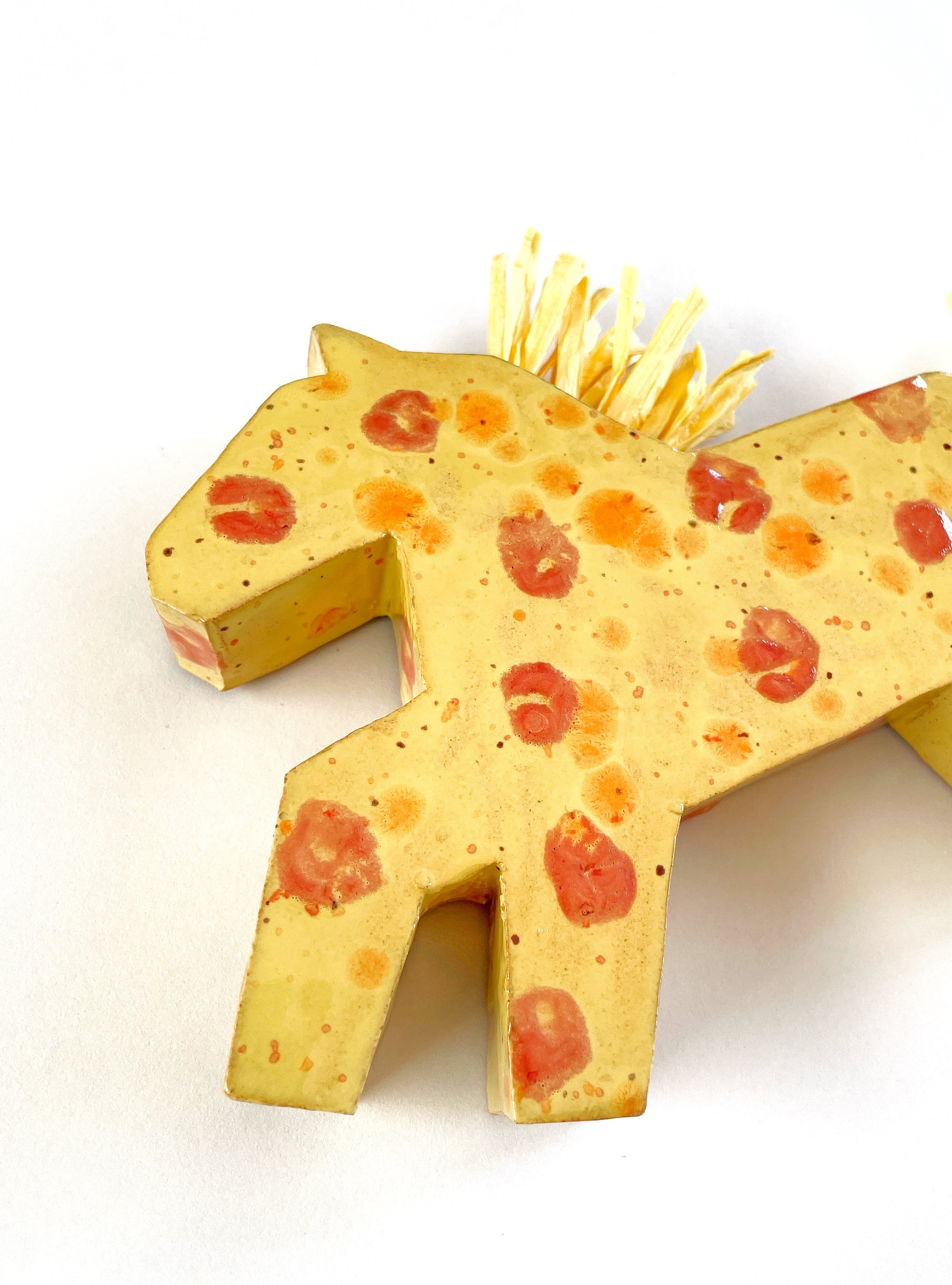 Objeto de decoración para colgar. Caballo de gres hecho a mano. Modelado, carvado y pintado con esmaltes cerámicos.