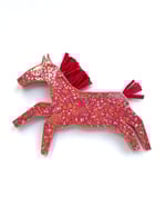 Objeto de decoración para colgar. Caballo de gres hecho a mano. Modelado, carvado y pintado con esmaltes cerámicos.